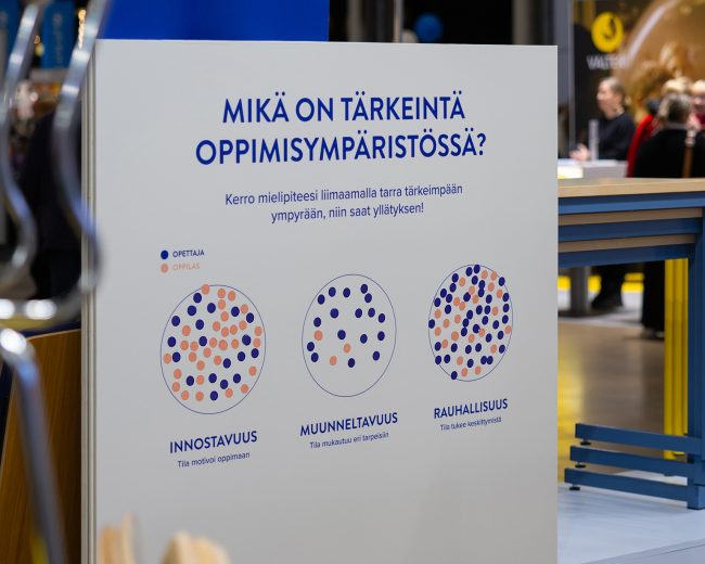 Messuosastollamme Educa 2026 -tapahtumassa toteuttamamme mielipidekyselyn tavoitteena oli selvittää, mitkä tekijät koetaan tärkeimmiksi oppimisympäristöissä. Vastaajia pyydettiin valitsemaan heidän mielestään merkittävin tekijä kolmesta vaihtoehdosta: innostavuus, muunneltavuus tai rauhallisuus.
